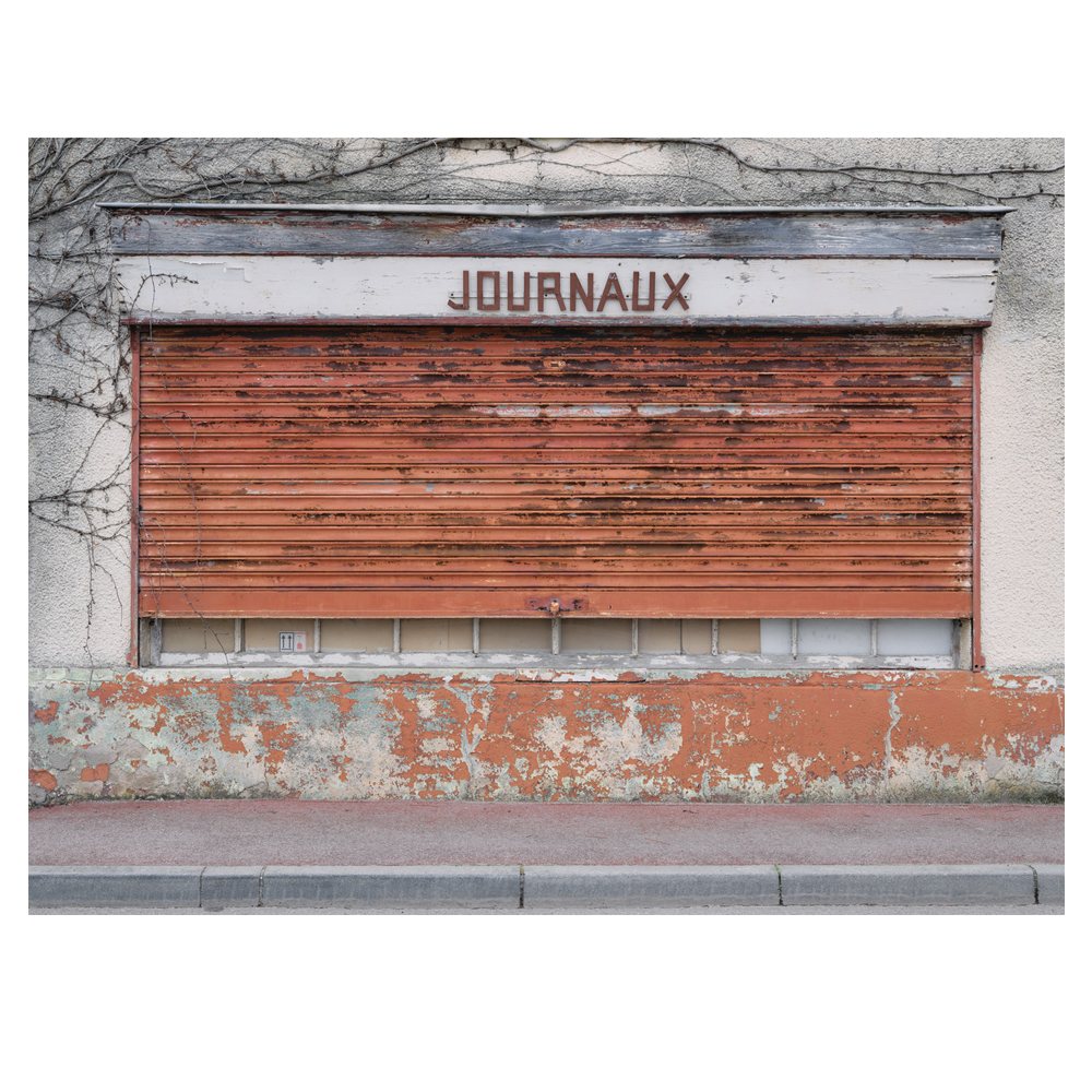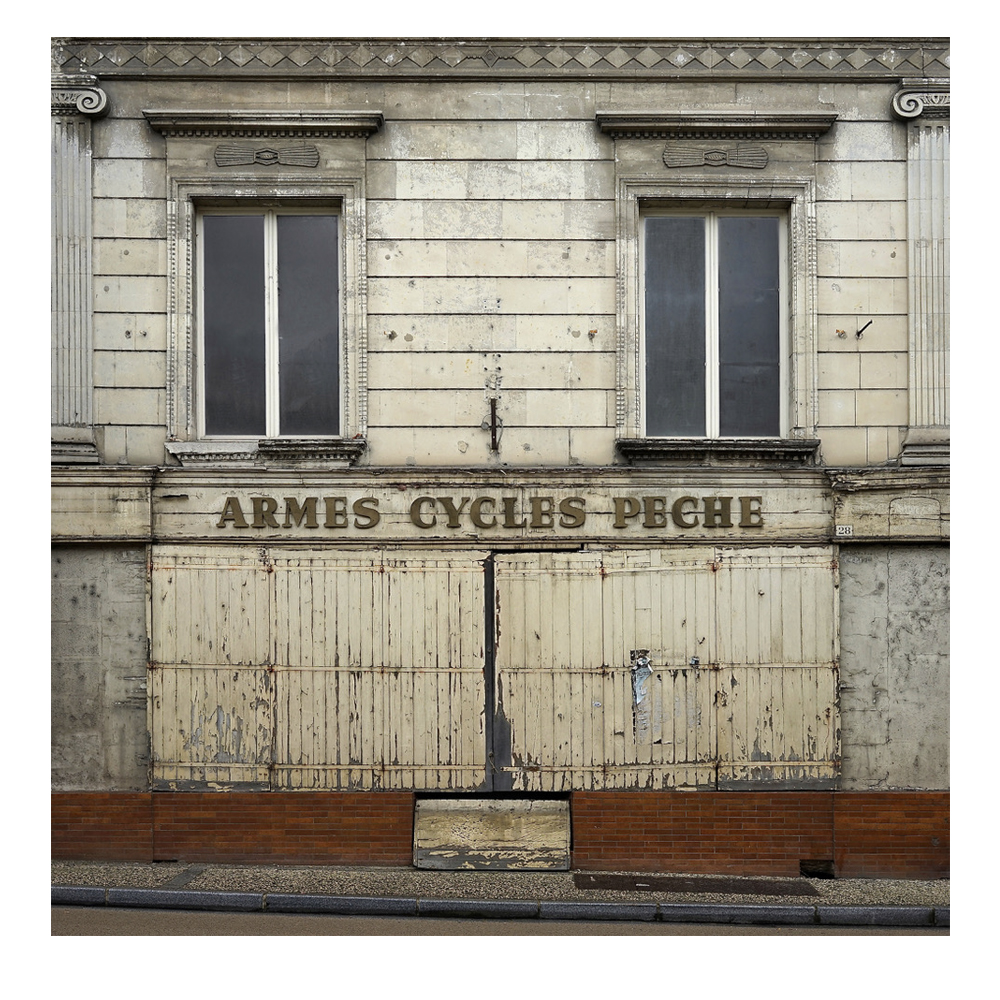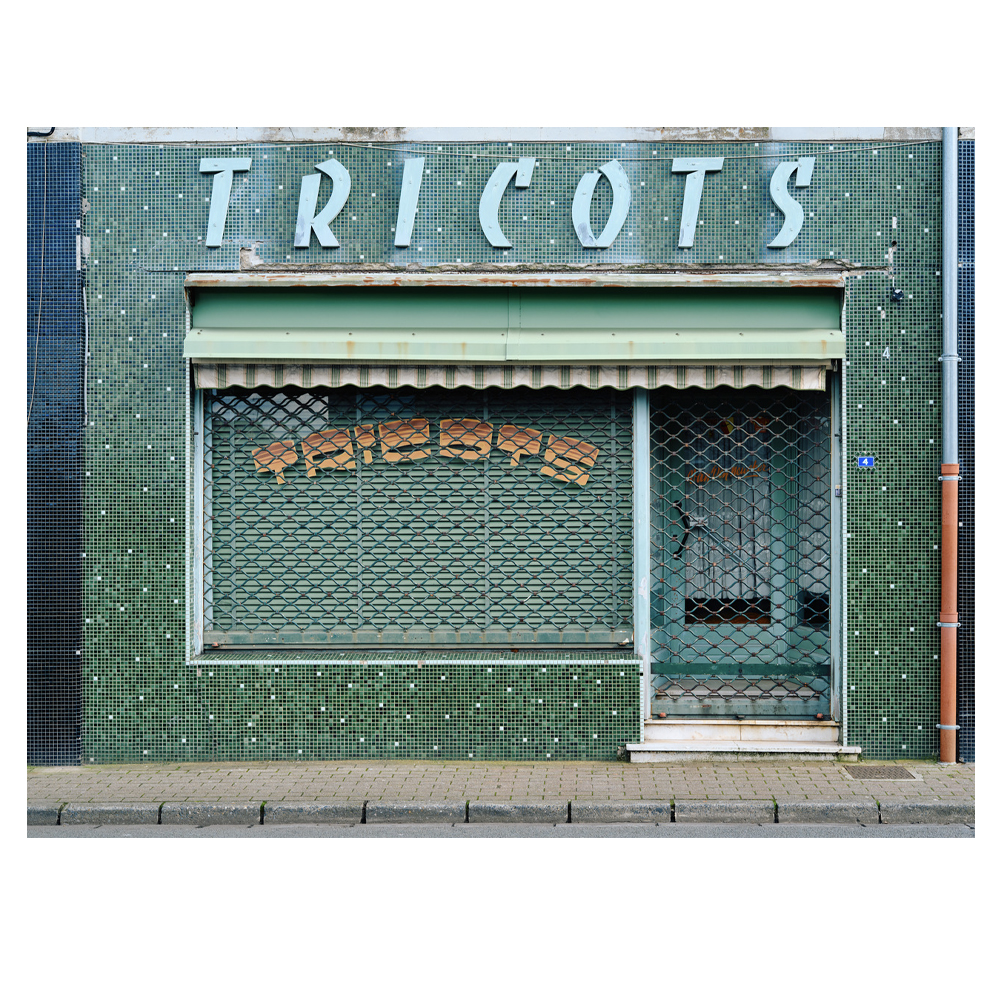 Ces petits commerces peuplent la ville fantôme de Thibaut Derien, formant un cimetière, un varia de traces, de vestiges d’une époque révolue, balayée par les industriels, les franchises et l’indifférence de clients envoutés par les sirènes de la consommation de masse et ses temples de tôle et de parpaings. Dans ce cimetière de boutiques, les rideaux sont baissés, tirés, les portes scellées, les fenêtres murées. Les devantures étouffent dans un cadre strict, qui éclipse tout le reste. Cette frontalité réduit les boutiques à leur seule façade, excluant toute profondeur de champ, anéantissant les volumes susceptibles de réanimer ces ruines exsangues et réduisant au silence ce qui faisait la particularité de ces commerces de proximité : le lien social.